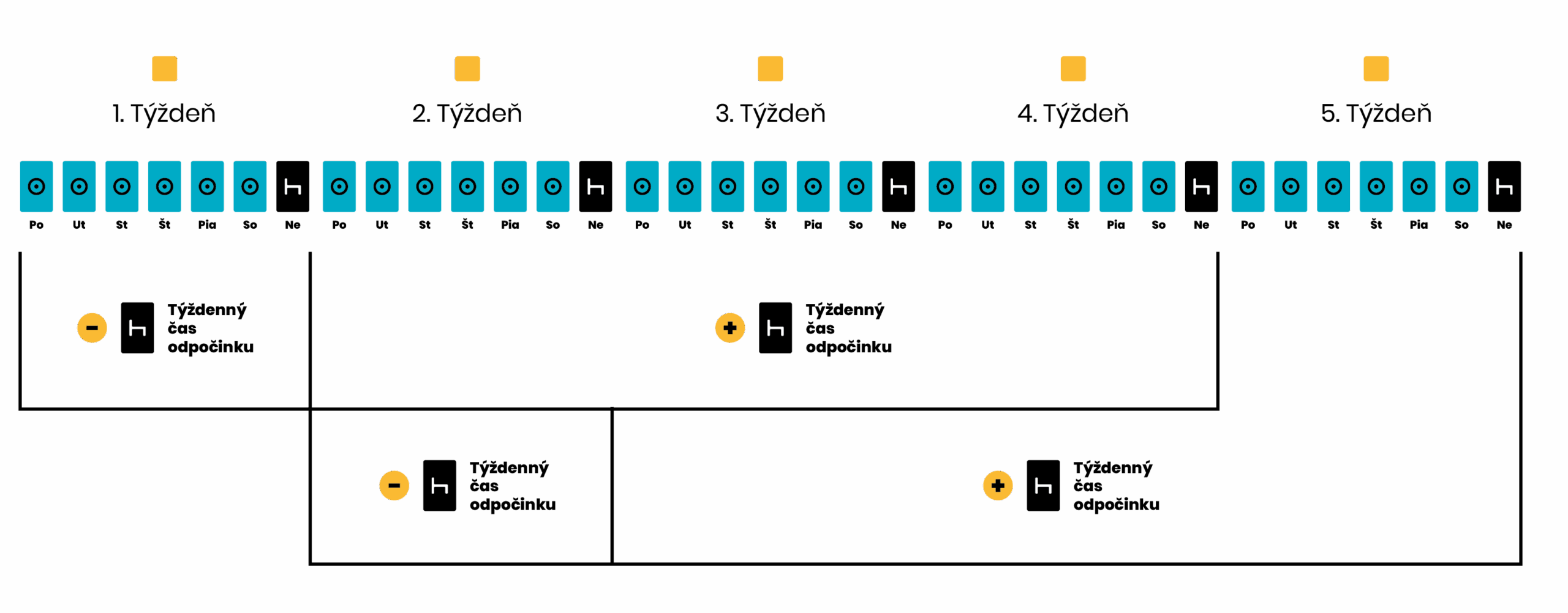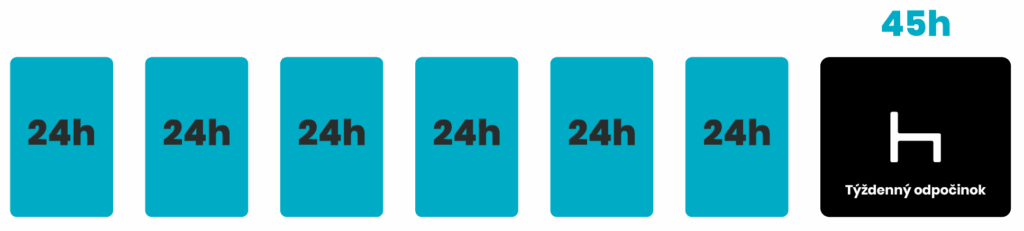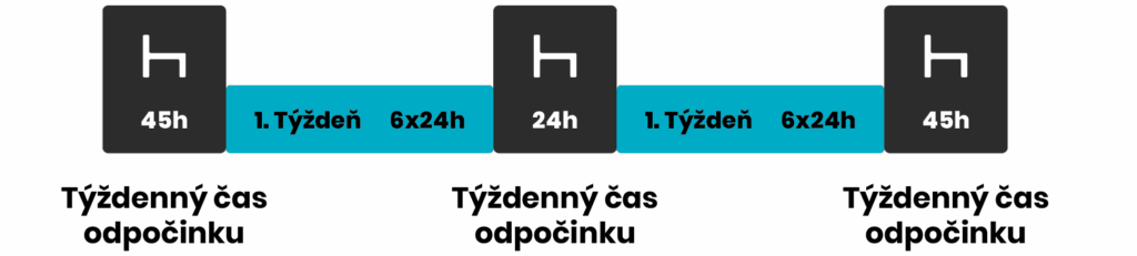 - Jednu dobu pravidelného týždenného odpočinku a jednu dobu skráteného týždenného odpočinku v trvaní aspoň 24 hodín. Avšak zníženie sa nahradí primeraným odpočinkom čerpaným vcelku pred ukončením tretieho týždňa nasledujúceho po predmetnom týždni.