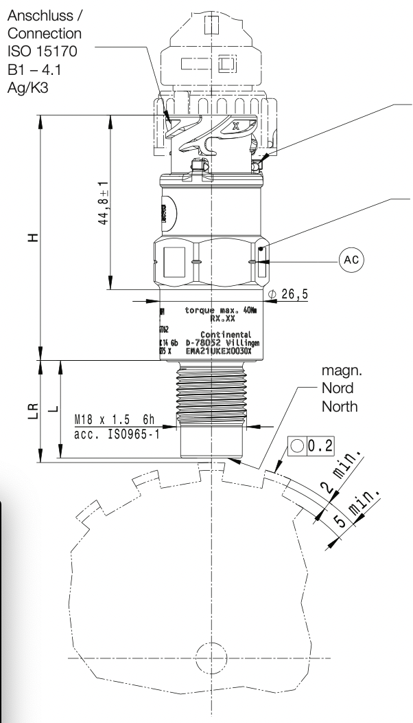 Dĺžku snímaču merajte vždy od začiatku závitu (podložky/gumičky snímaču) až po koniec. Táto dĺžka je tiež označovaná ako L (Pozri tu) zatiaľ, čo vzdialenosť od prevodu je LR a celková dĺžka snímaču je L+H – Doťahovať momentnom max 40Nm